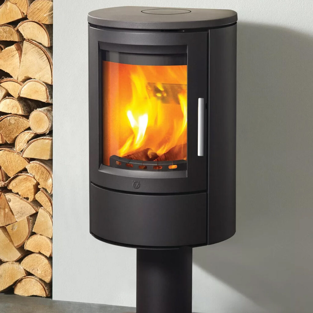 The Aura11 Wood Burning Stove is the tallest Model in the Varde Range. The Aura 11 Pedestal stove stands out with its elegant plinth stand, elevating the stove to create a clean and lightweight appearance. Crafted from steel and cast iron the Aura 11 features a powerful airwash system to ensure the large curved glass door remains clean during operation, and a disc grate is provided for easy ash removal. The door handle is designed to stay cool to the touch for user comfort combining convenience with effortless Scandinavian style.