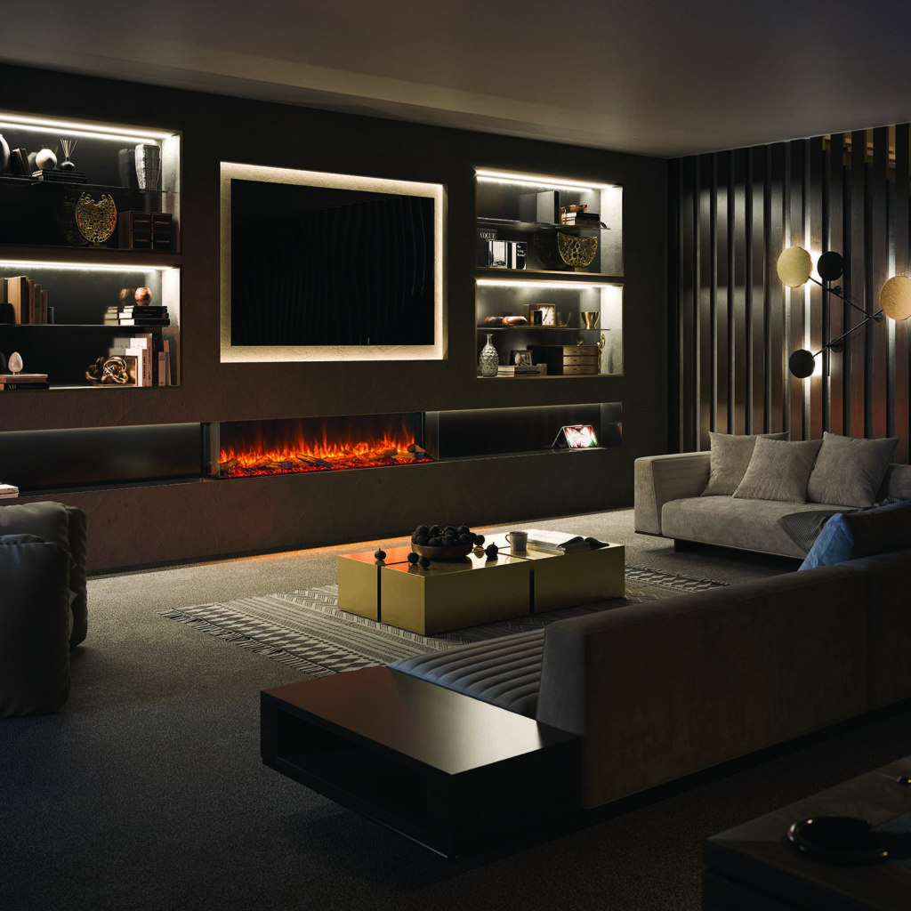 The Gazco eReflex 195RW electric fire, being the largest in its lineup, stands as a captivating media wall centrepiece. This cutting-edge electric fireplace combines contemporary design with exceptional heating performance and can be installed as a multi-sided, corner, or single-sided centrepiece, creating a focal point that not only enhances your home’s aesthetic but also delivers the warmth and comfort you desire.