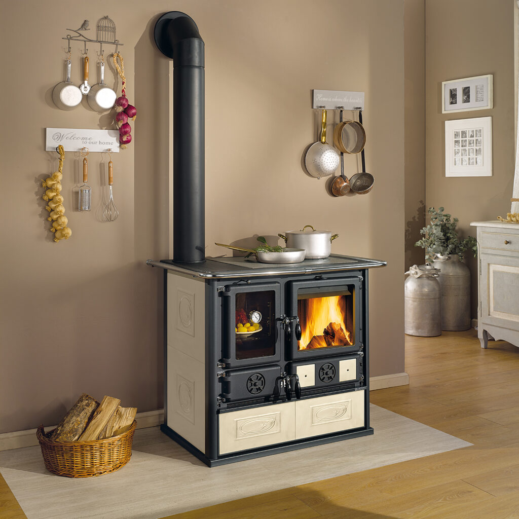 The La Nordica Rosa Sinistra Reverse has designed to bring elegance and functionality to your kitchen Experience the joy of cooking with wood, while efficiently heating your space. The Rosa Sinistra Reverse features a combustion system for optimal heat distribution and energy efficiency. Equipped with a spacious cooking surface and oven, this cooker is perfect for preparing delicious meals and baked goods with that unmistakable wood-fired flavour.