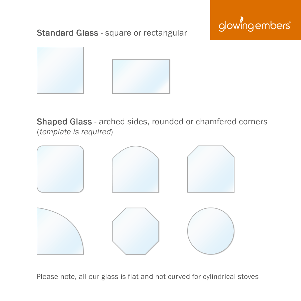 If your glass features any form of shaping such as arched sides, rounded or chamfered corners, please select YES to Shaped Glass (see image above for examples of shaped glass). Then add to the basket the quantity you require. All shaped glass requires an accurate, full size template posting to us with your name and order number to Glowing Embers, Albert Rd, Braintree, Essex, CM7 3JQ. Please note, we cannot accept emailed templates and custom cut glass is non-refundable.